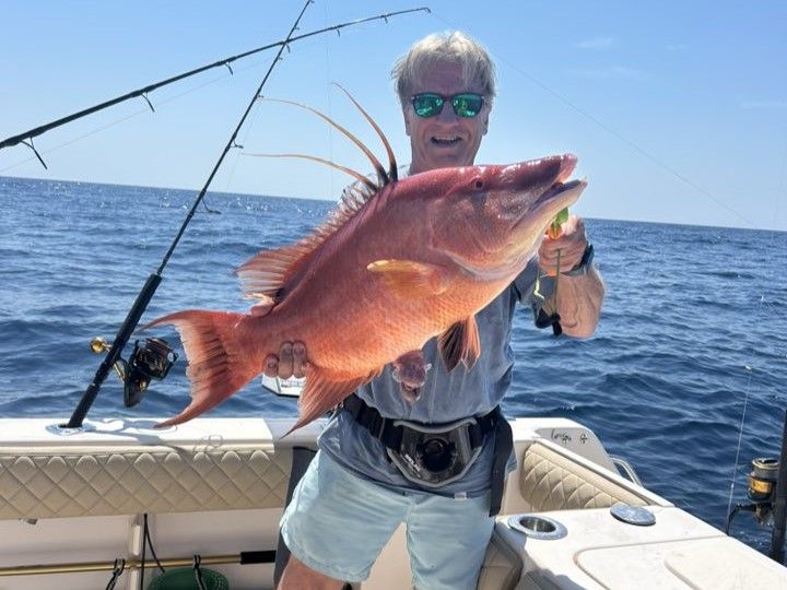 Scamp Grouper are one of the most sought-after bottom fish in these waters, and for good reason. These guys typically run 3 to 8 pounds and are absolute bulldogs when hooked. They're most active during the cooler months from October through March, holding tight to hard bottom structure in 80 to 200 feet of water. What makes scamp so special is their incredible table fare - sweet, flaky white meat that's perfect for any preparation. When you hook one, expect a hard initial run followed by that classic grouper head-shaking fight as they try to get back to their hole.